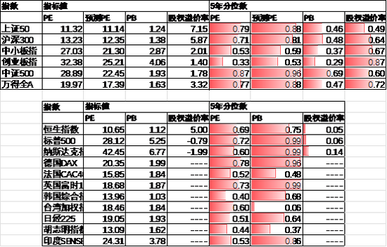近期万得全A预测PE17.39倍,处于88%分位水平,股权溢价率3.32%,处于72%分位水平。市场估值分位数位于中性区间。
