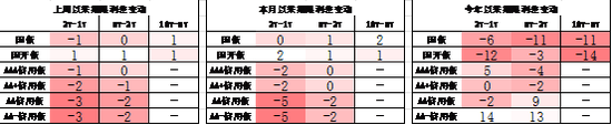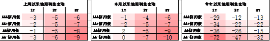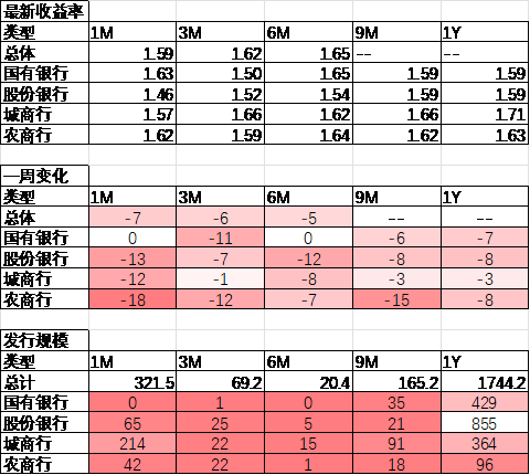 同业存单方面,上周发行利率有所下行,其中发行规模最多的1Y股份银行下行8BP,为1.59%;1Y国有银行下行7BP,为1.59%。