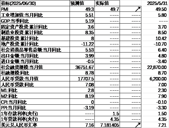 1、国家统计局公布,6月份,我国制造业、非制造业和综合PMI分别为49.7%、50.5%和50.7%,比上月上升0.2、0.2和0.3个百分点,装备制造业、高技术制造业和消费品行业PMI均连续两个月位于扩张区间。