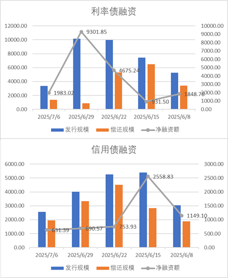 债券融资方面,上周利率债净融资额1983.02亿,维持大额净发行;信用债净融资额631.39亿,较此前有所回落。上周债券净发行量有所下降。
