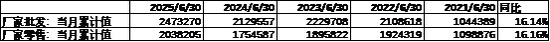 汽车销量方面,25年6月汽车批发及零售销量同比增速分别为16.14%及16.16%,汽车销量维持较高水平。