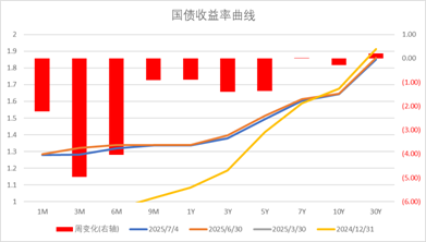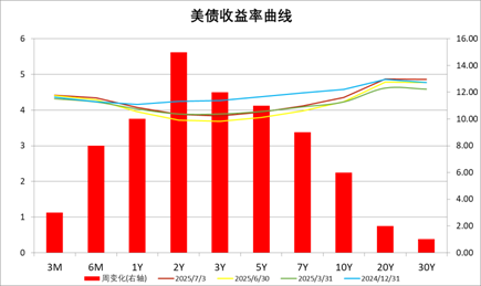 上周美元指数下行27.32BP,虽然美国就业数据超预期,但国会通过OBBB法案使得市场担心美国财政风险,美元有所下行。在此背景下人民币上周升值83个基点,日元升值17.25个基点。