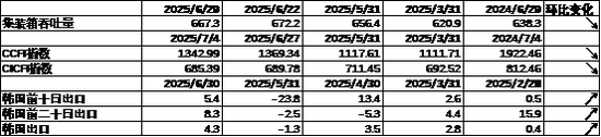进出口数据方面,上周出口运价走强,同时韩国6月出口数据有所回升。