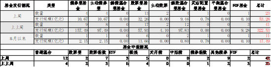 基金申报与发行方面,上周共计申报基金42支,其中普通混合型基金12支,债券类基金(17支)少于股票类基金(11支),FOF基金申报2支。发行一边,上周基金共计发行53.28亿,其中股票型基金发行规模有所回落。